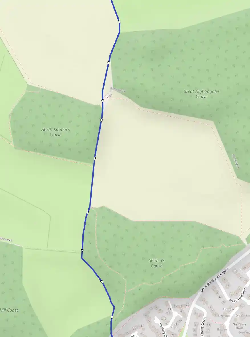 From Rotherwick Church go L down the road, past the Coach & Horses to the first field R (250m). Turn R along the hedge and go straight on to the cross track in the trees near houses (650m), ahead over a stream and up ast the side path L (400m), round a slight bend and R of the wood (300m).
